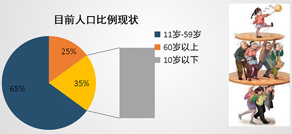 報(bào)告稱2015年以后我國將進(jìn)入人口老齡化迅速發(fā)展時(shí)期。預(yù)測顯示,從2015-2035年的20年時(shí)間里,中國老年人口比例將會(huì)達(dá)到20%;到2050年,老年人口總量超過4億,高齡老人達(dá)到9500萬,60歲及以上老人比重將超過30%,社會(huì)進(jìn)入深度老齡化階段。