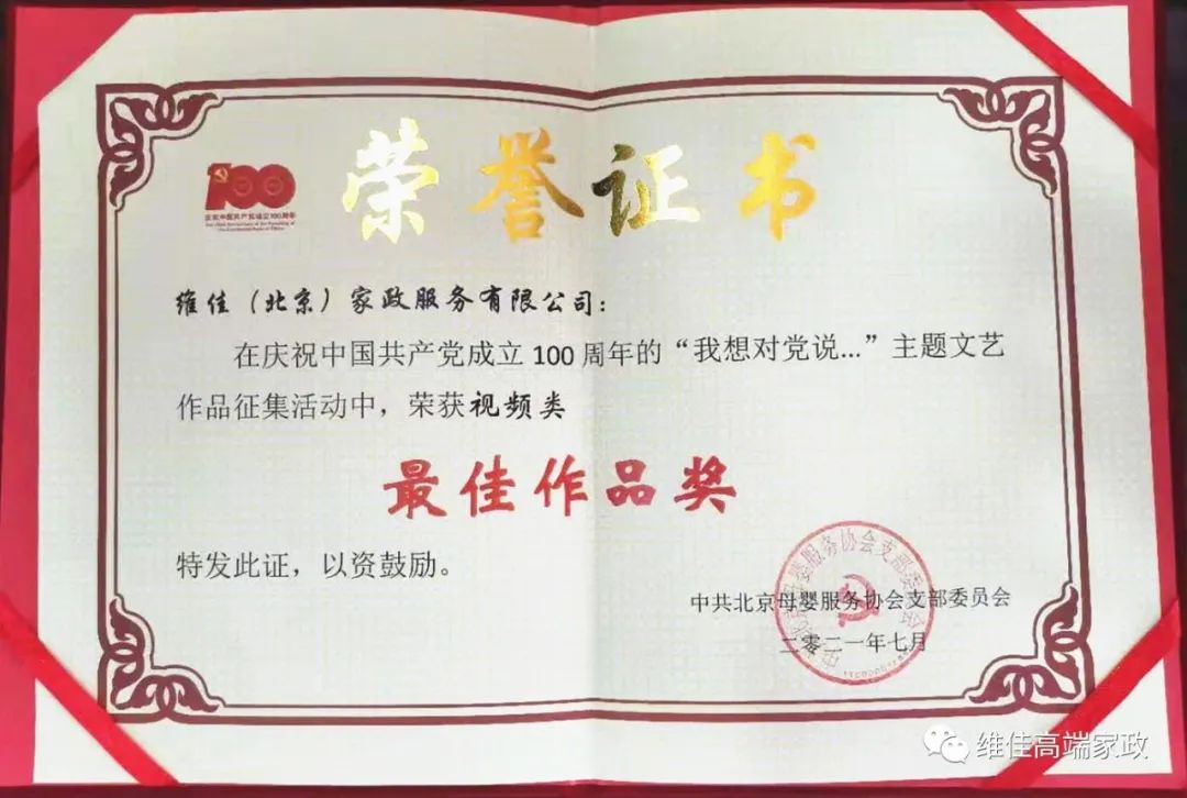 近日,維佳公司拍攝的一段短視頻在北京母嬰服務(wù)協(xié)會(huì)主辦的慶祝中國(guó)共產(chǎn)黨成立100周年“我想對(duì)黨說(shuō)…”主題文藝作品征集大賽中榮獲視頻類(lèi)最佳作品獎(jiǎng)。