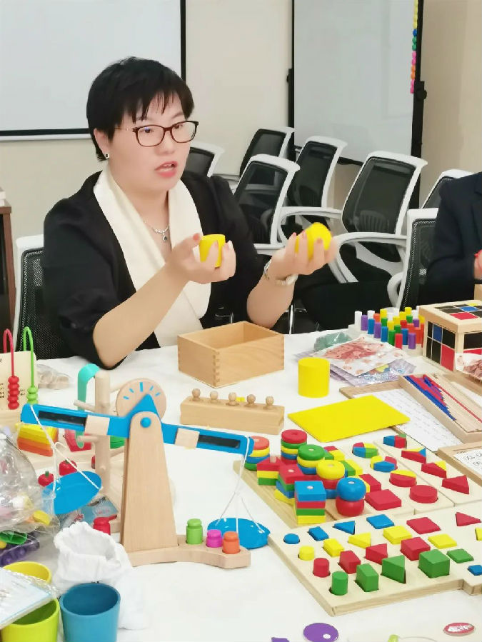 9月3日,鎂瑛慧管家學(xué)院管家講師Kathleen教管家們蒙氏教具的操作方法。